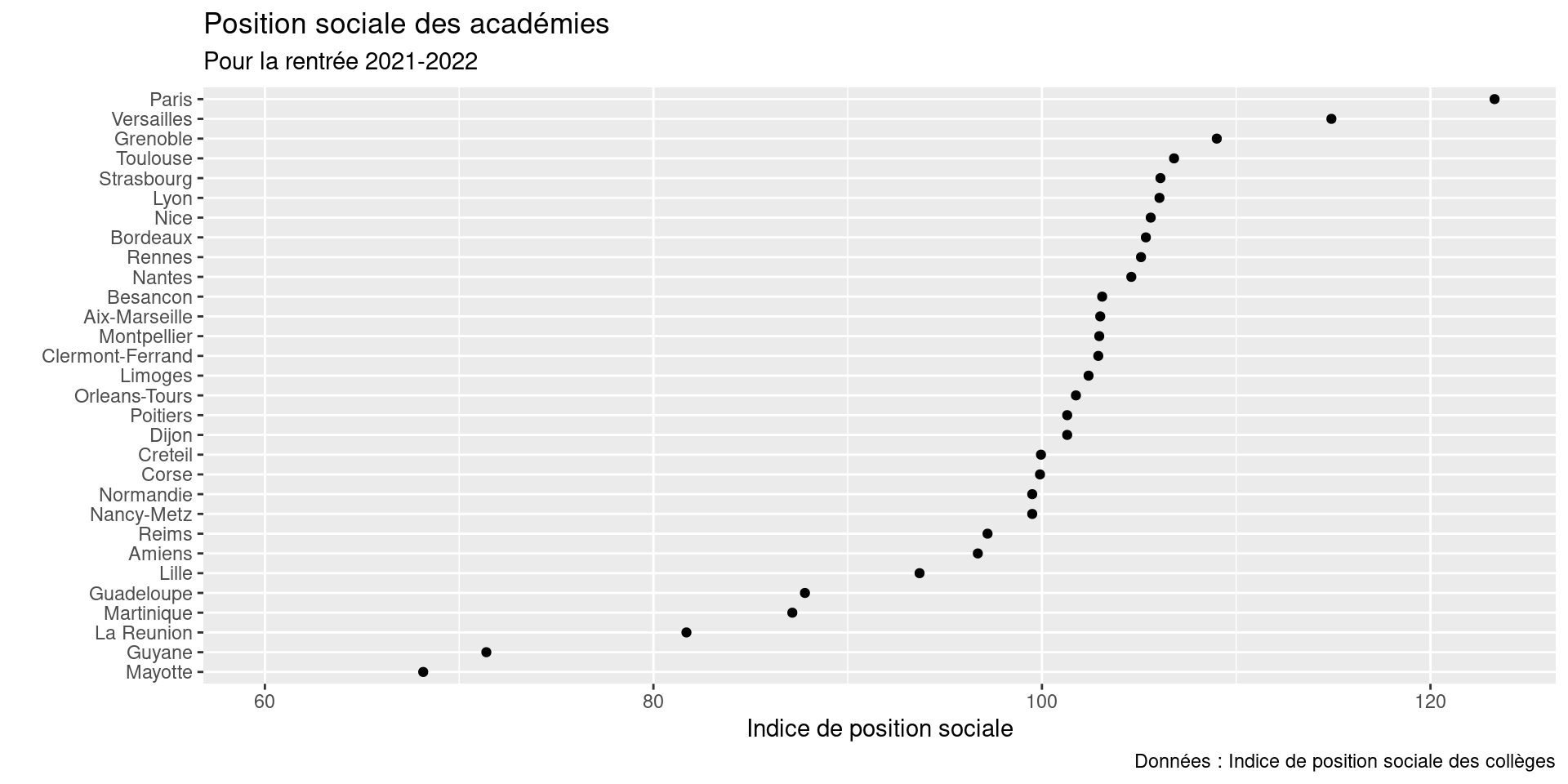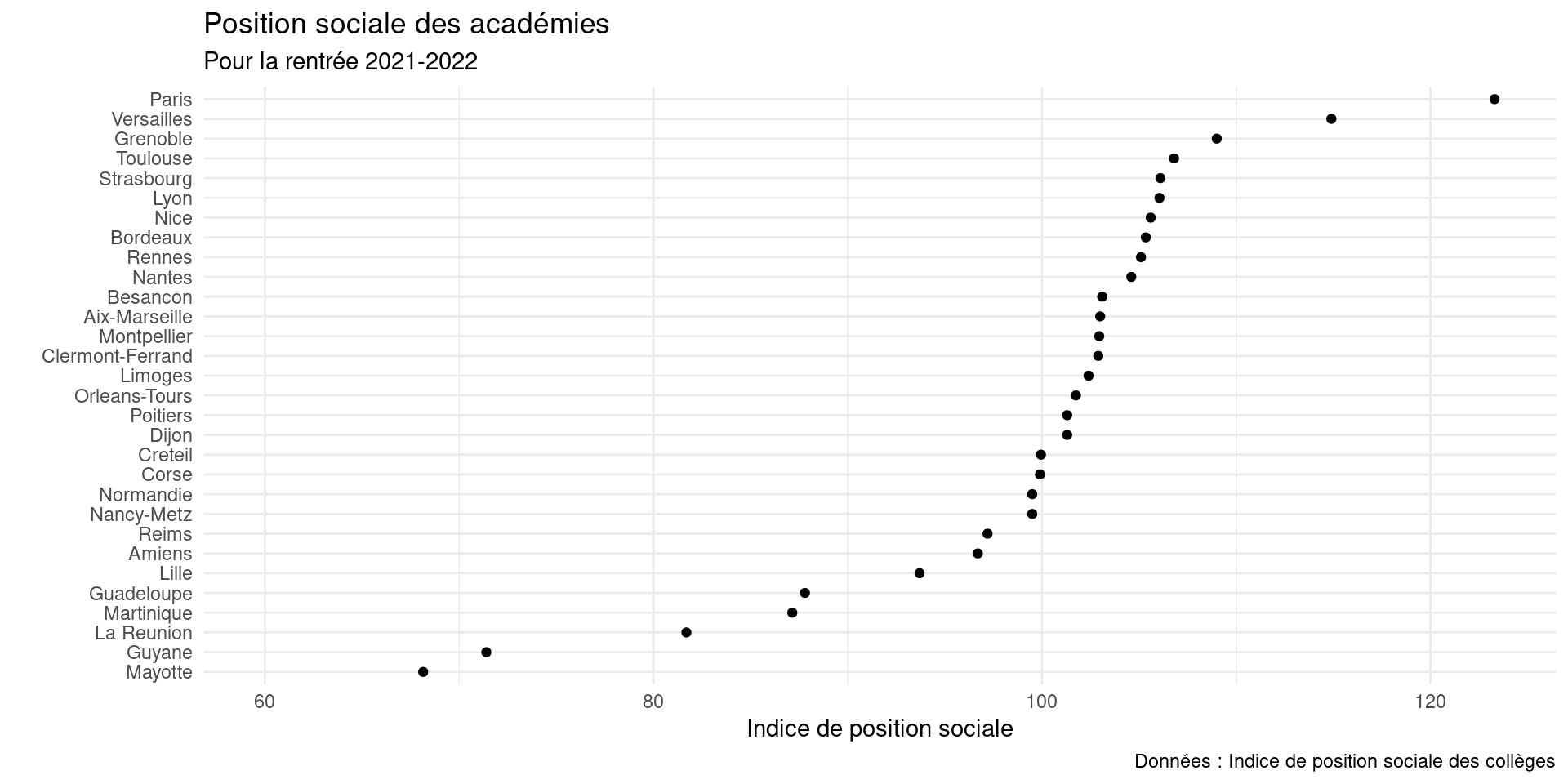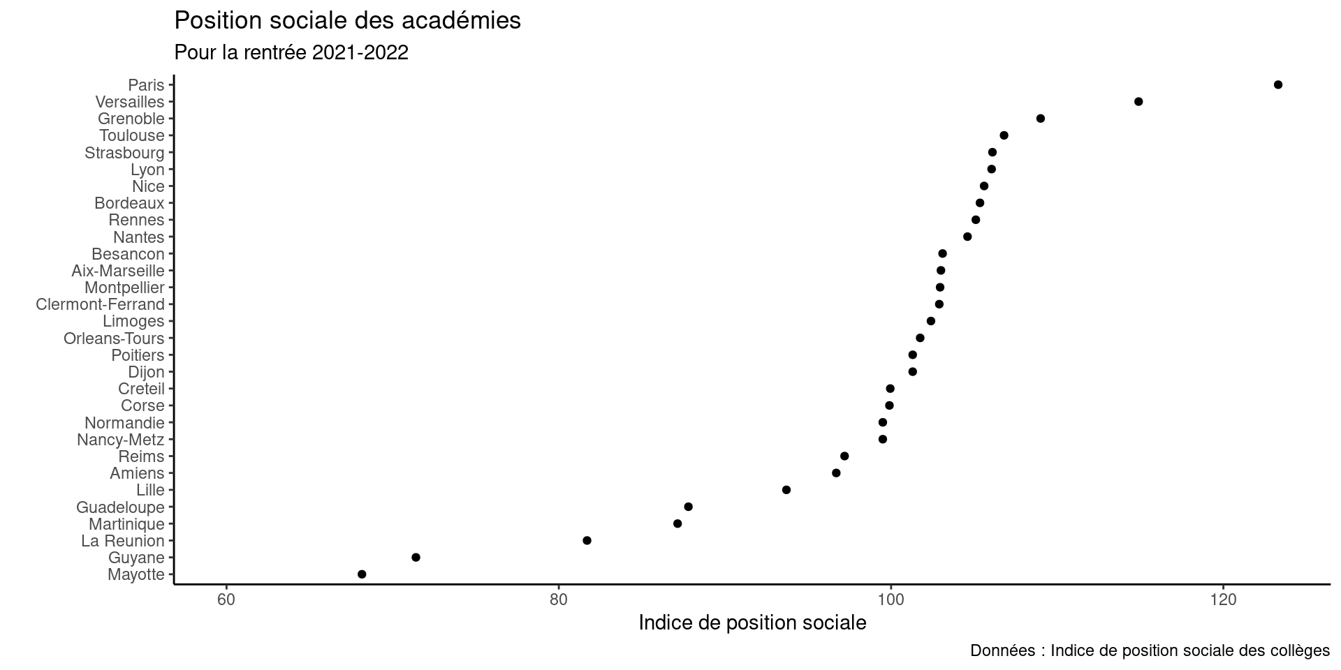 p =ggplot(ips, aes(y = forcats::fct_reorder(str_to_title(academie), ips),x = ips)) +stat_summary(fun ="median", geom ="point") +coord_cartesian(xlim =c(60, NA)) +labs(x ="Indice de position sociale",y ="",title ="Position sociale des académies",subtitle ="Pour la rentrée 2021-2022",caption ="Données : Indice de position sociale des collèges")