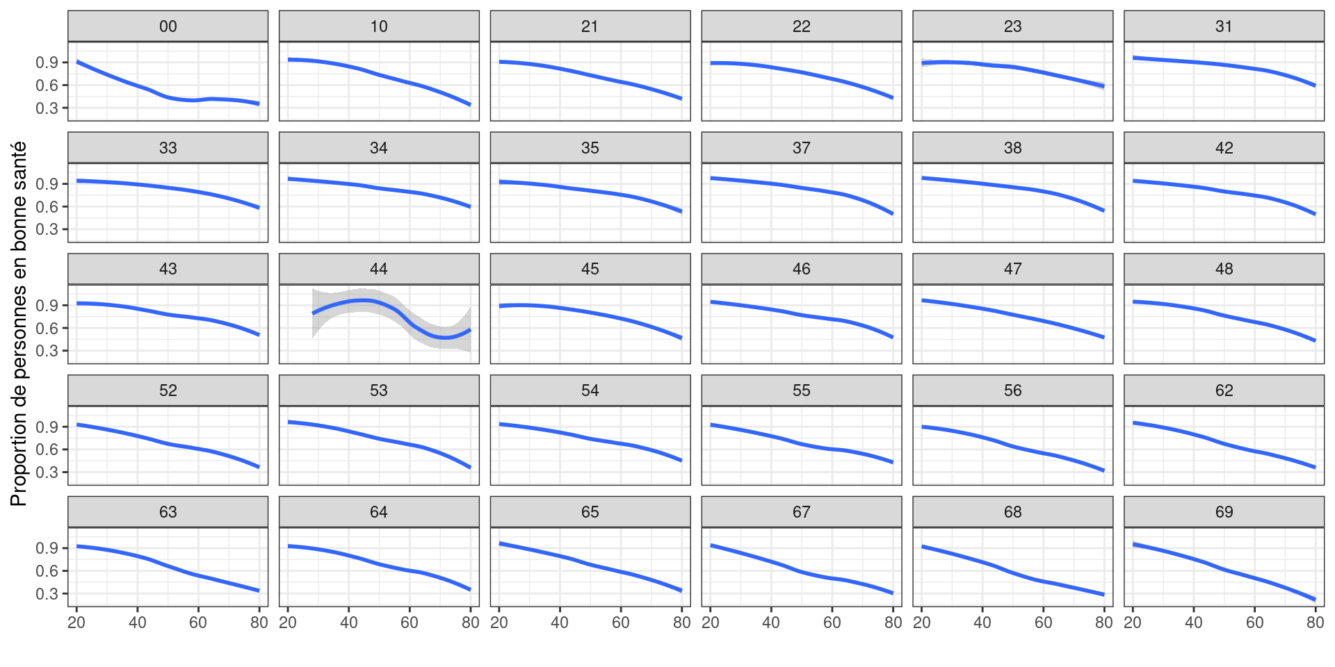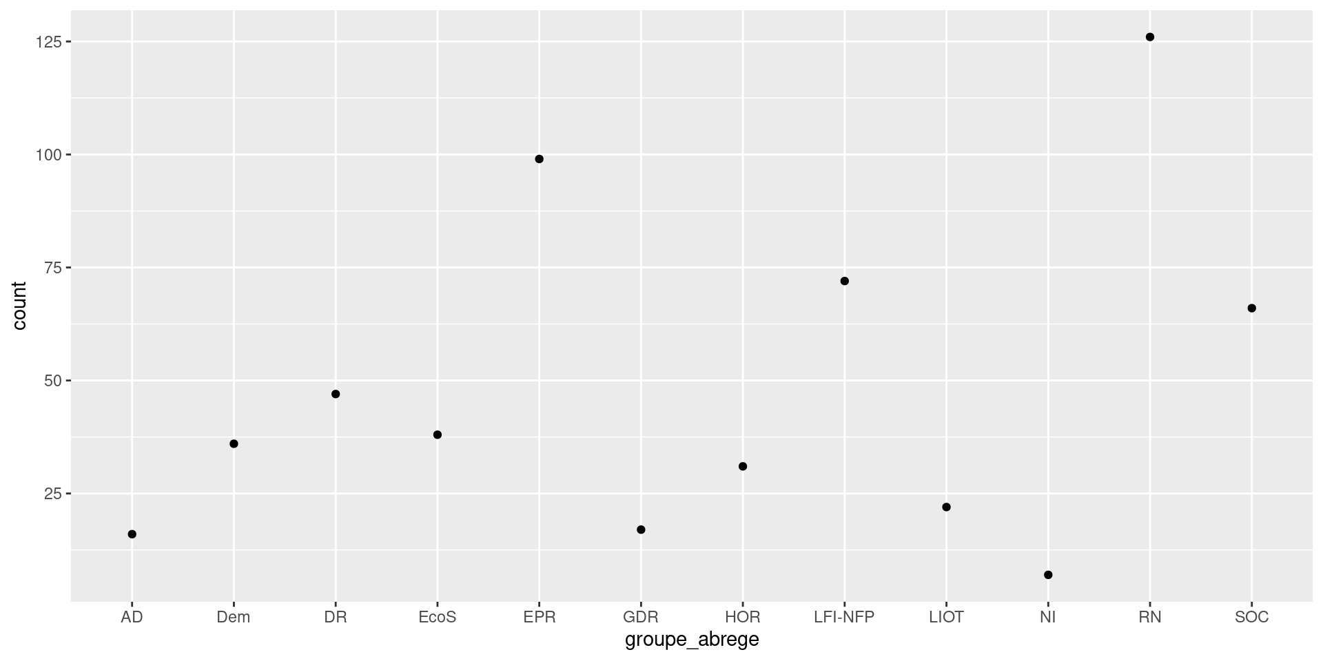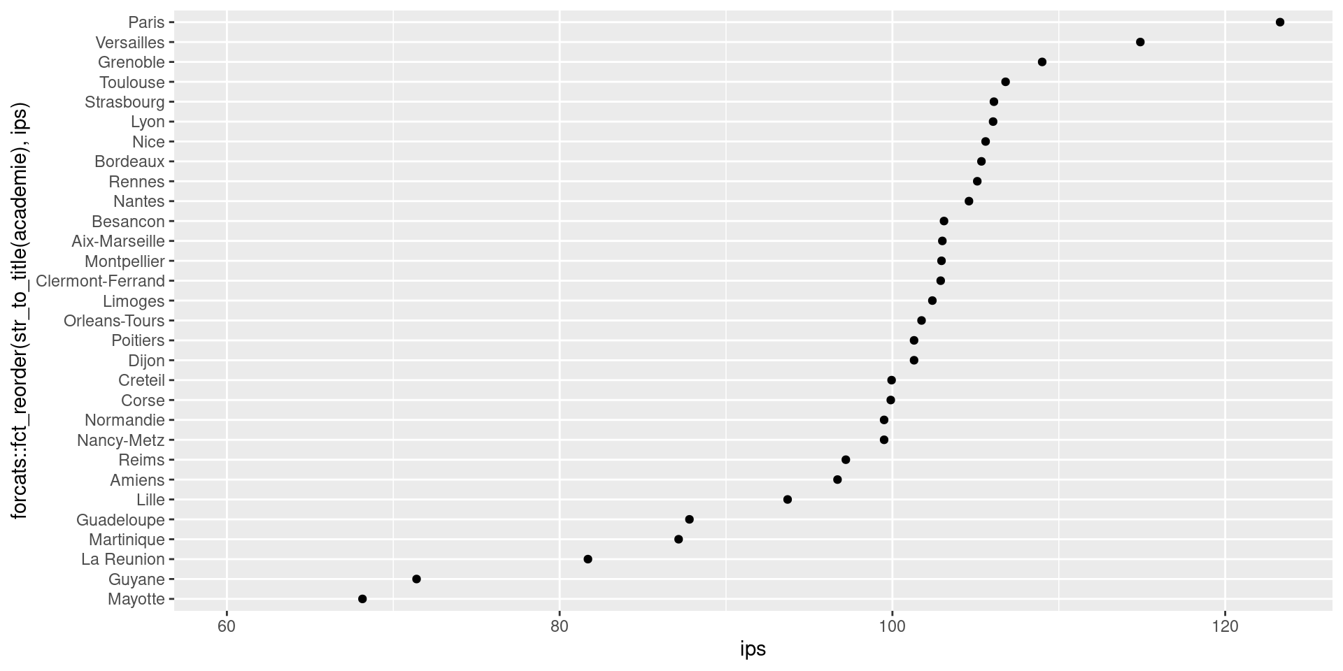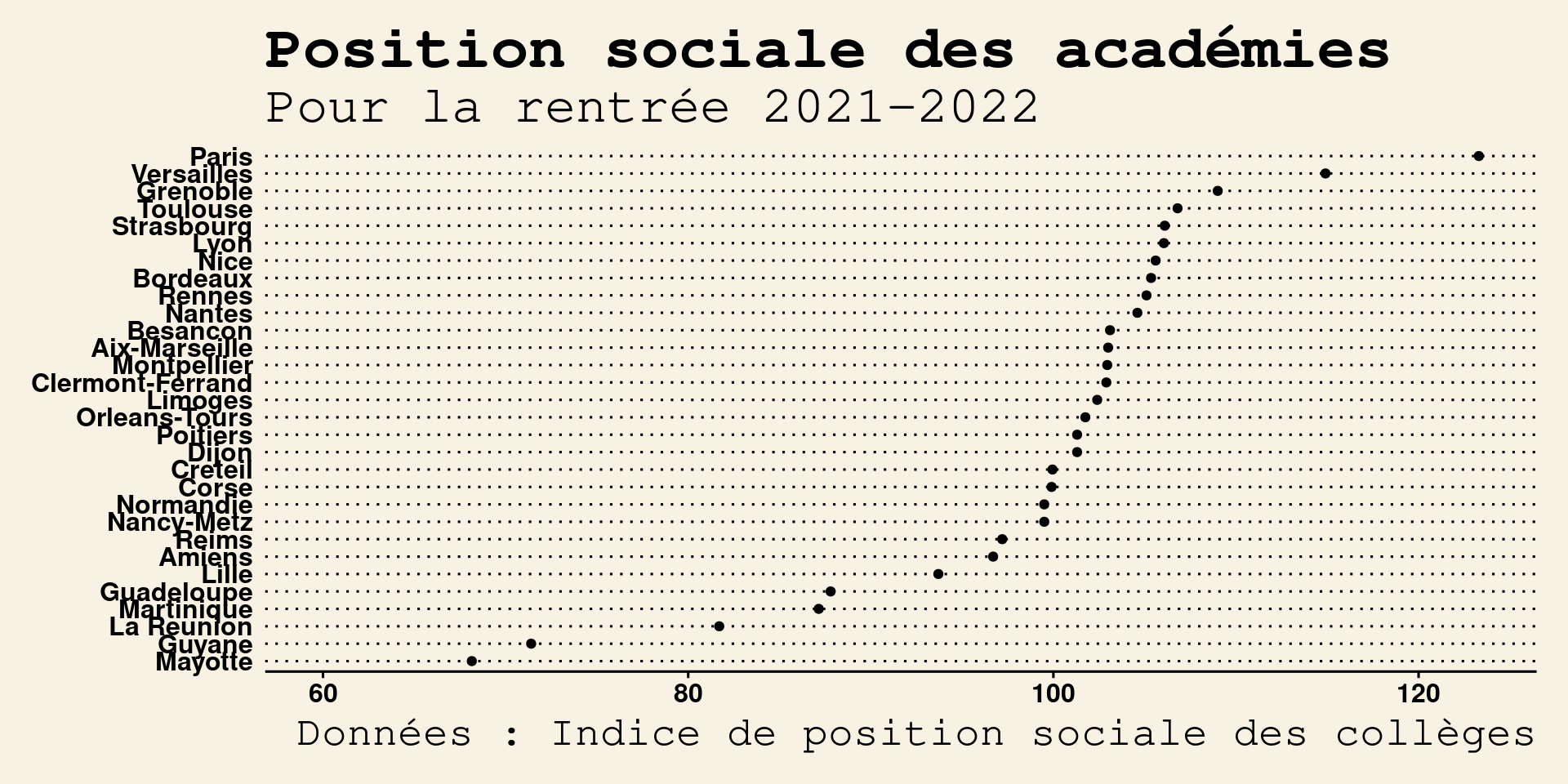 p =ggplot(ips, aes(y = forcats::fct_reorder(str_to_title(academie), ips),x = ips)) +stat_summary(fun ="median", geom ="point") +coord_cartesian(xlim =c(60, NA)) +labs(x ="Indice de position sociale",y ="",title ="Position sociale des académies",subtitle ="Pour la rentrée 2021-2022",caption ="Données : Indice de position sociale des collèges")